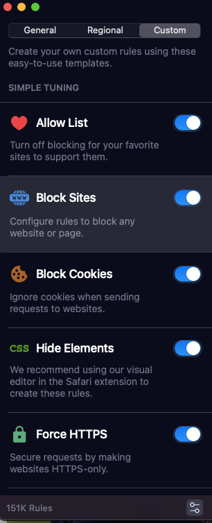 The features and customization options on 1Blocker’s paid plan are extensive and highly customizable. Features for Safari are broken down into General, Regional, and Custom options.