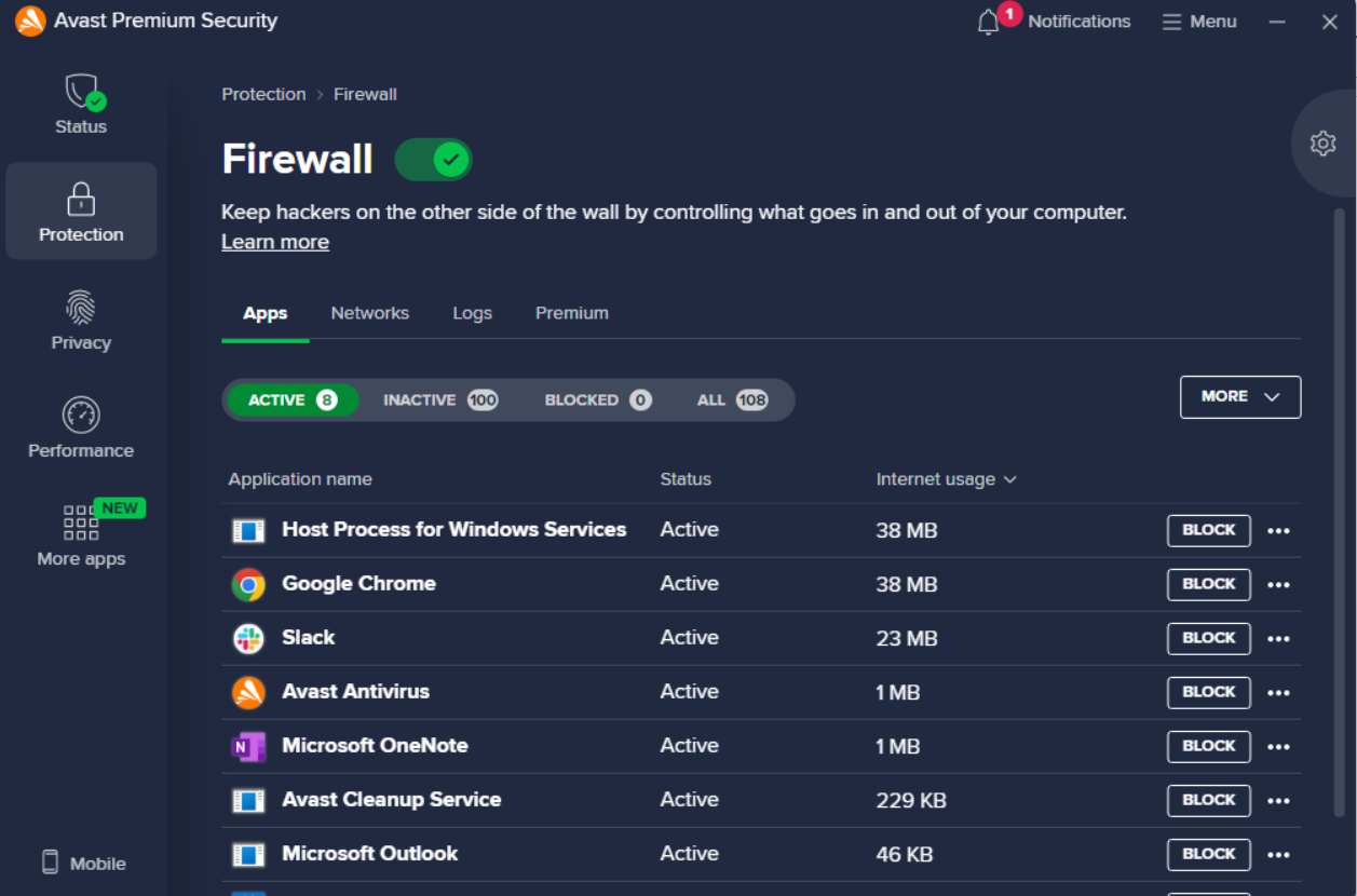 Avast Premium Security offers a firewall, but only on the Windows app. It monitors network traffic between your device and outside networks to keep unauthorized users from invading your security.