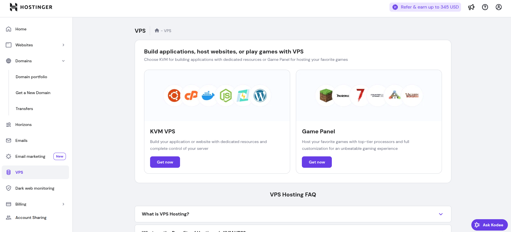 AI assistant: Hostinger’s AI assistant, Kodee, helps you navigate basic server management tasks like server setup and software installation with step-by-step guidance, making it great for beginners who haven’t used a virtual server before but don’t have the budget for a managed option.