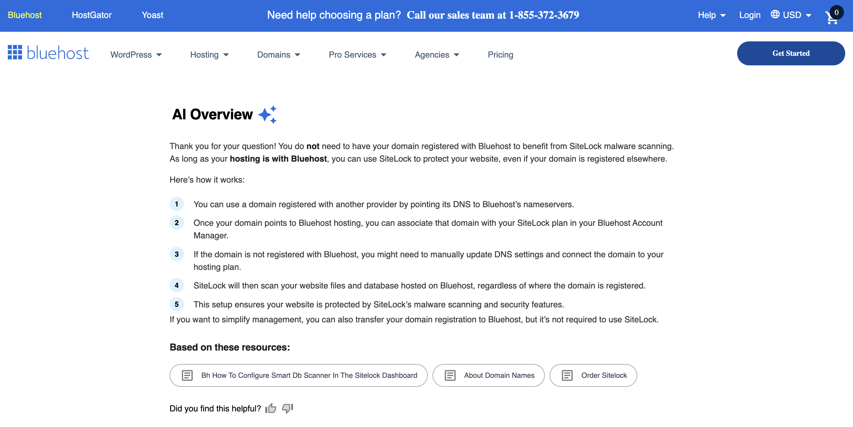 On the self-support side, both brands have a thorough knowledge base and supplemental materials like courses and guides. Bluehost also provides an AI summary for knowledge base inquiries, which HostGator does not. Depending on personal preference, this could be a plus, or it could be a waste of time because you end up checking the source material anyway.