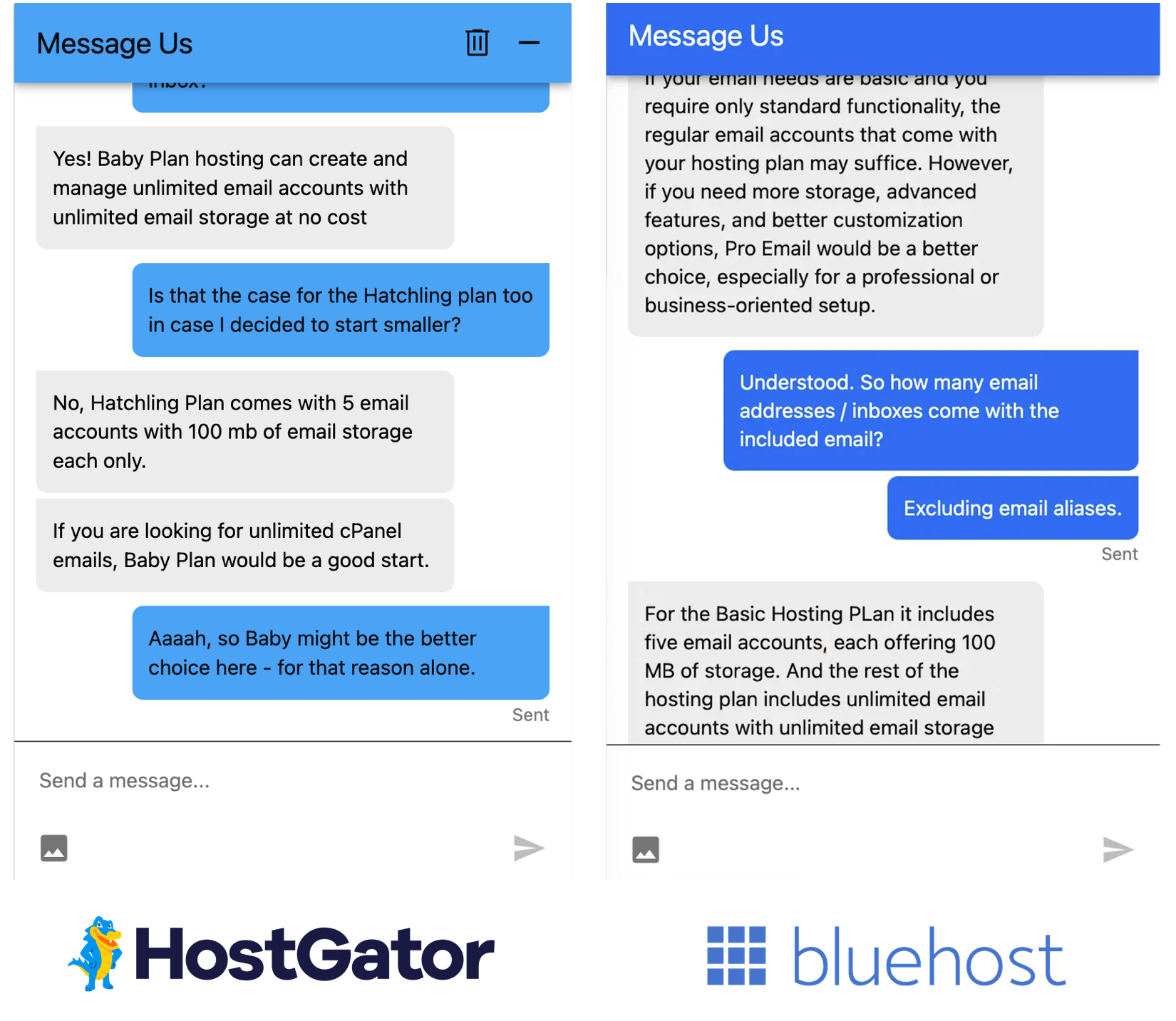 Both hosts offer 24/7 chat support across all plans. Phone support is added starting with their respective second-tier plans. In practice — at least on the chat side — customer support is provided by the same people. In other words, HostGator support is Bluehost support and vice versa. Phone support likely functions the same, though we can’t confirm this. That aside, the agents are genuinely helpful and friendly, and response times are fast.