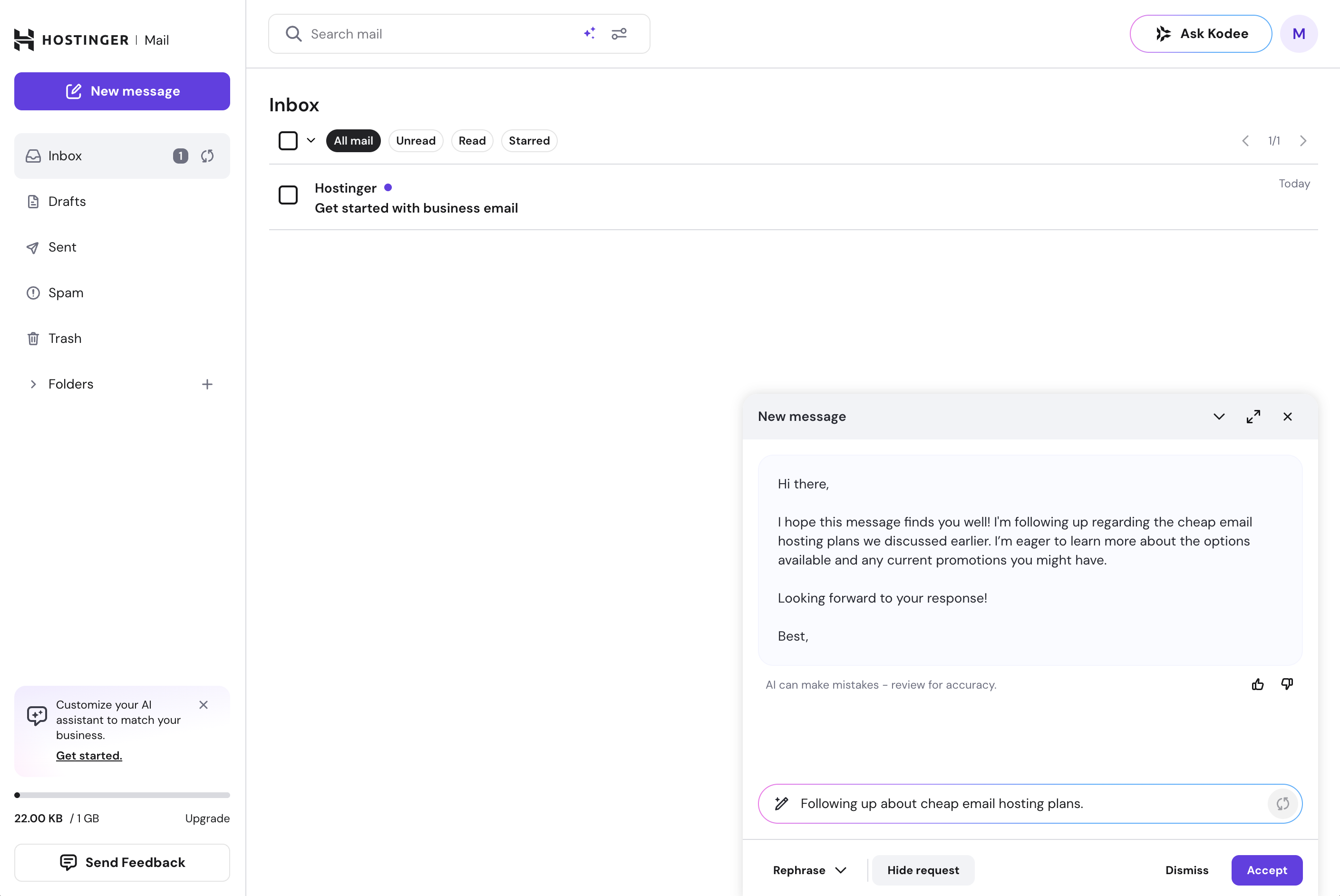 AI features: Hostinger allows you to generate email drafts with simple prompts and choose from multiple conversation tones and styles.