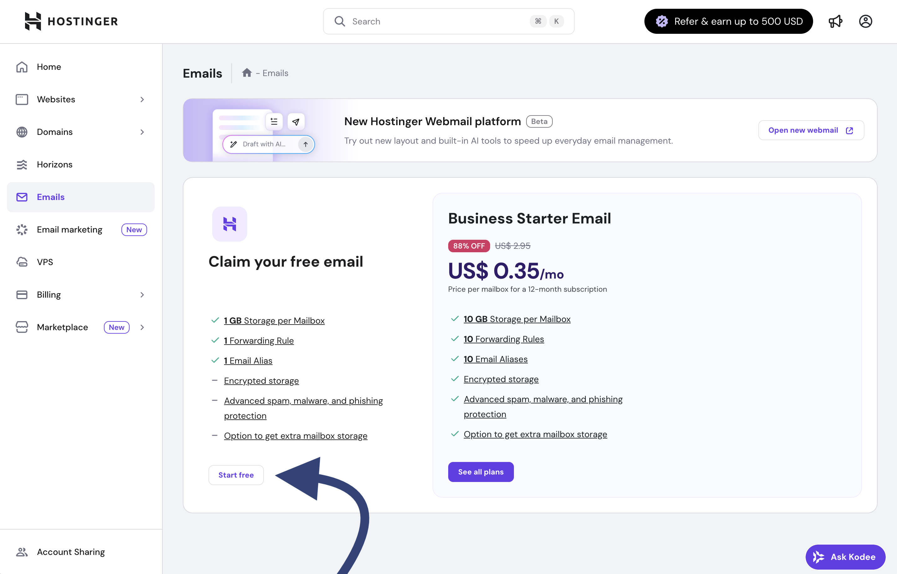 Free plan with web hosting: Notably, Hostinger offers free email hosting with its web hosting plans. The features are limited compared to the two paid plans, but it’s enough for basic email, and it provides a buffer before you have to buy a plan.
