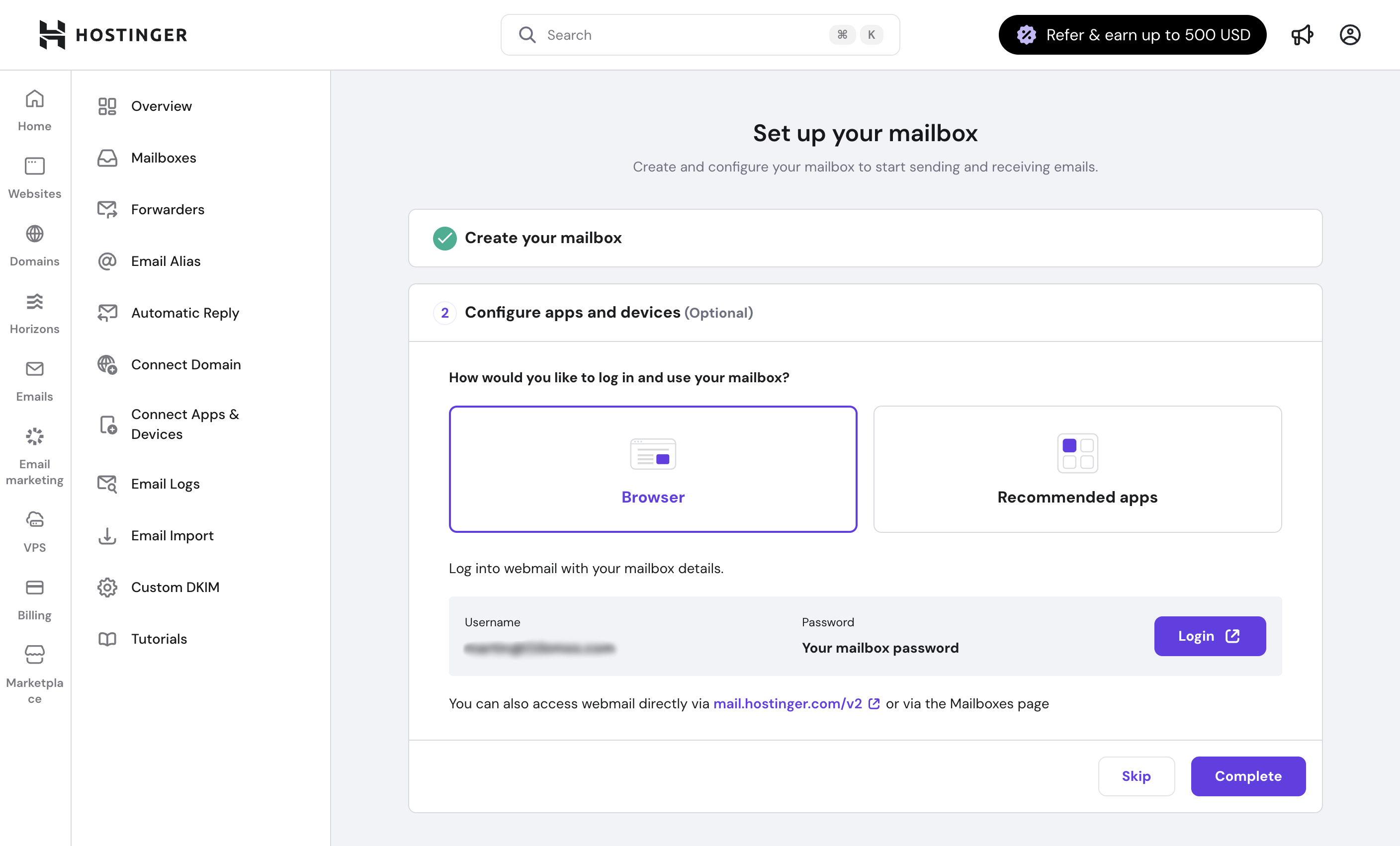 We used our Hostinger web hosting account to access the free 1-year email plan. Of the three hosts, Hostinger’s setup process was the easiest to follow. Its hPanel color scheme, with deep purple buttons against a white background, made it impossible to get lost.