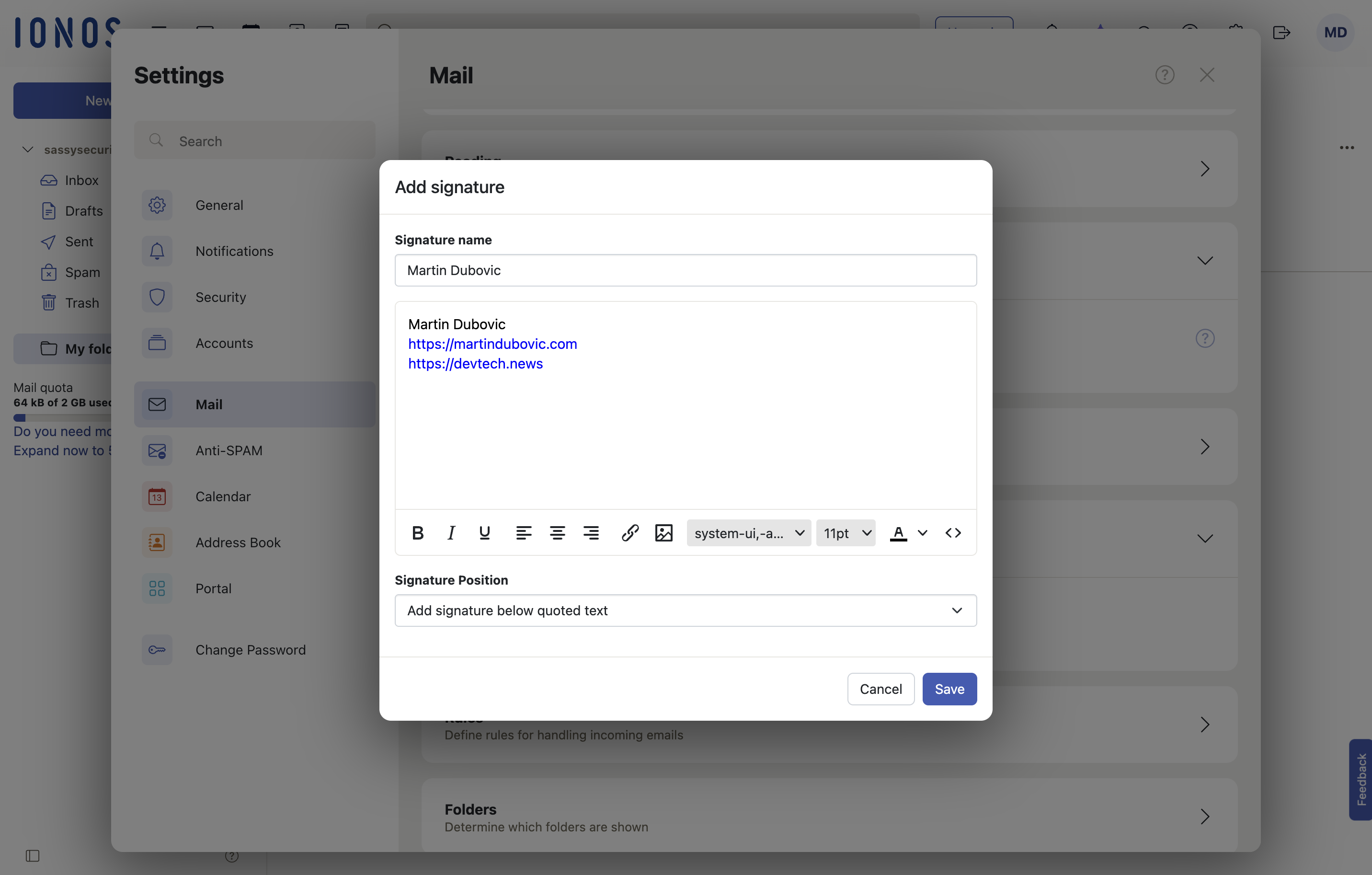 Email signature: IONOS allows you to easily create custom email signatures that are automatically added to outbound emails.
