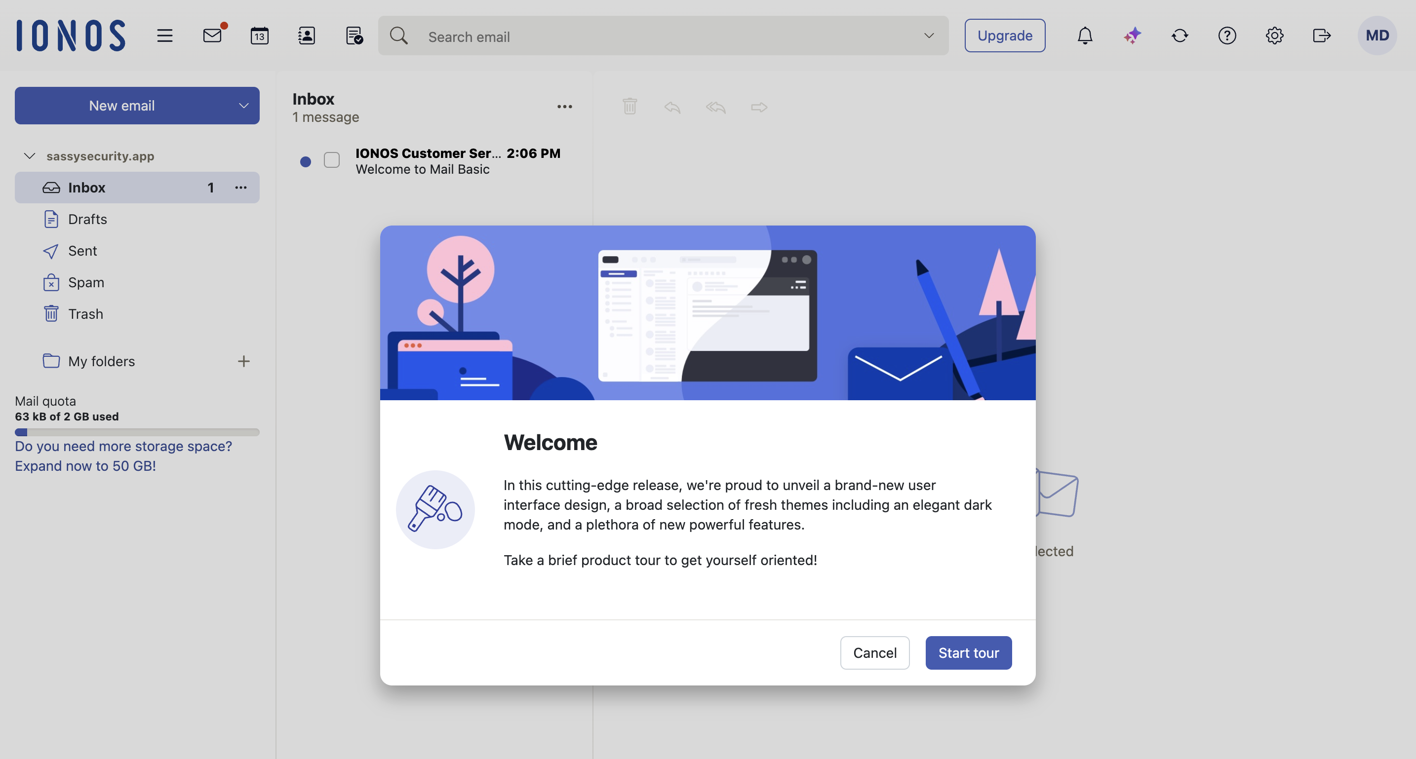 We tested the IONOS email hosting Basic plan. It’s automatically included with IONOS’s web hosting, making it a great option if you’re looking for a web and email hosting combo plan.