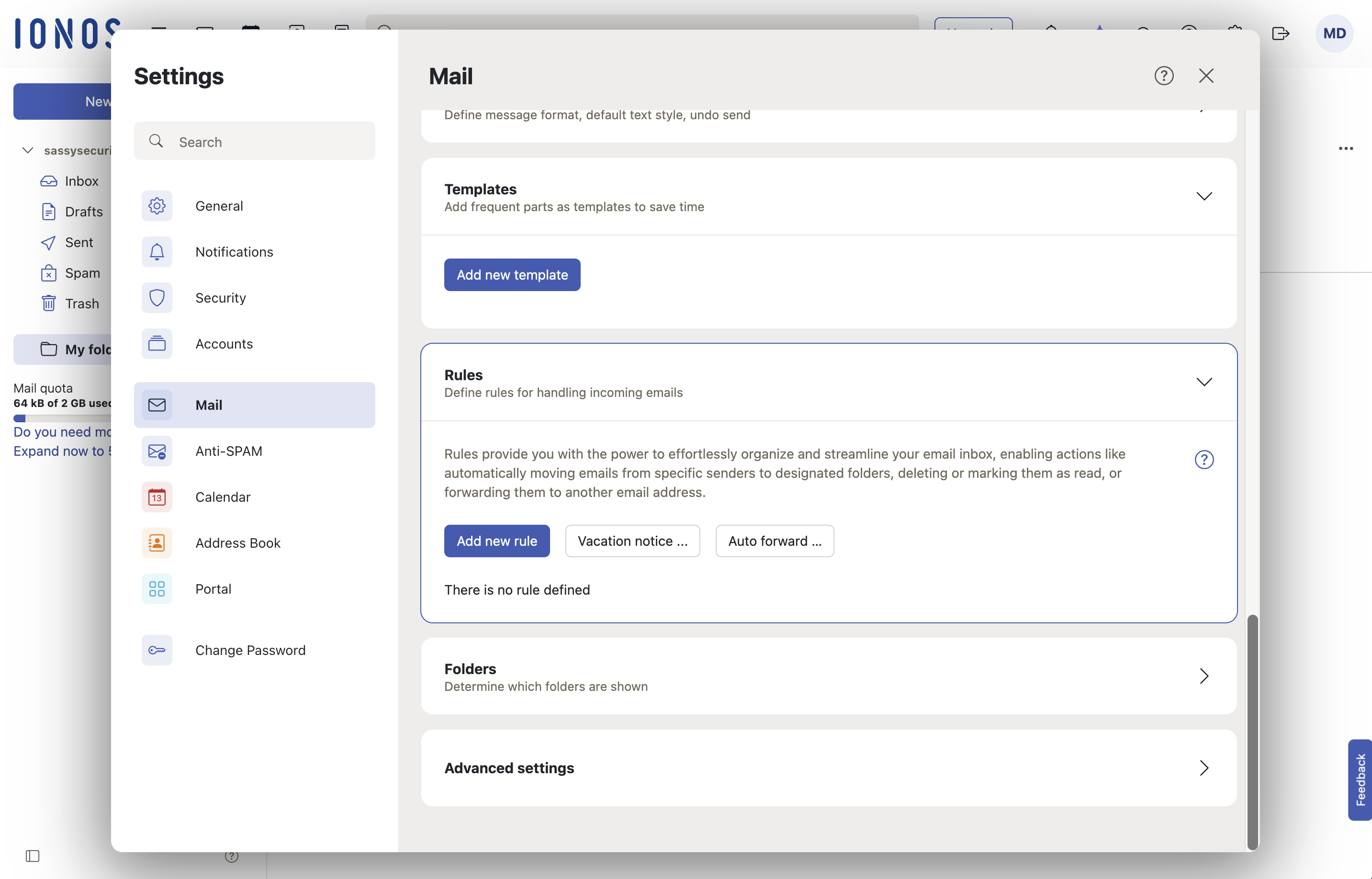 Rules to filter emails: The IONOS email hosting plans allow you to organize incoming email messages with one or more rules. You can trigger actions, including moving emails to a specific folder, forwarding them to another address, or marking them as read.