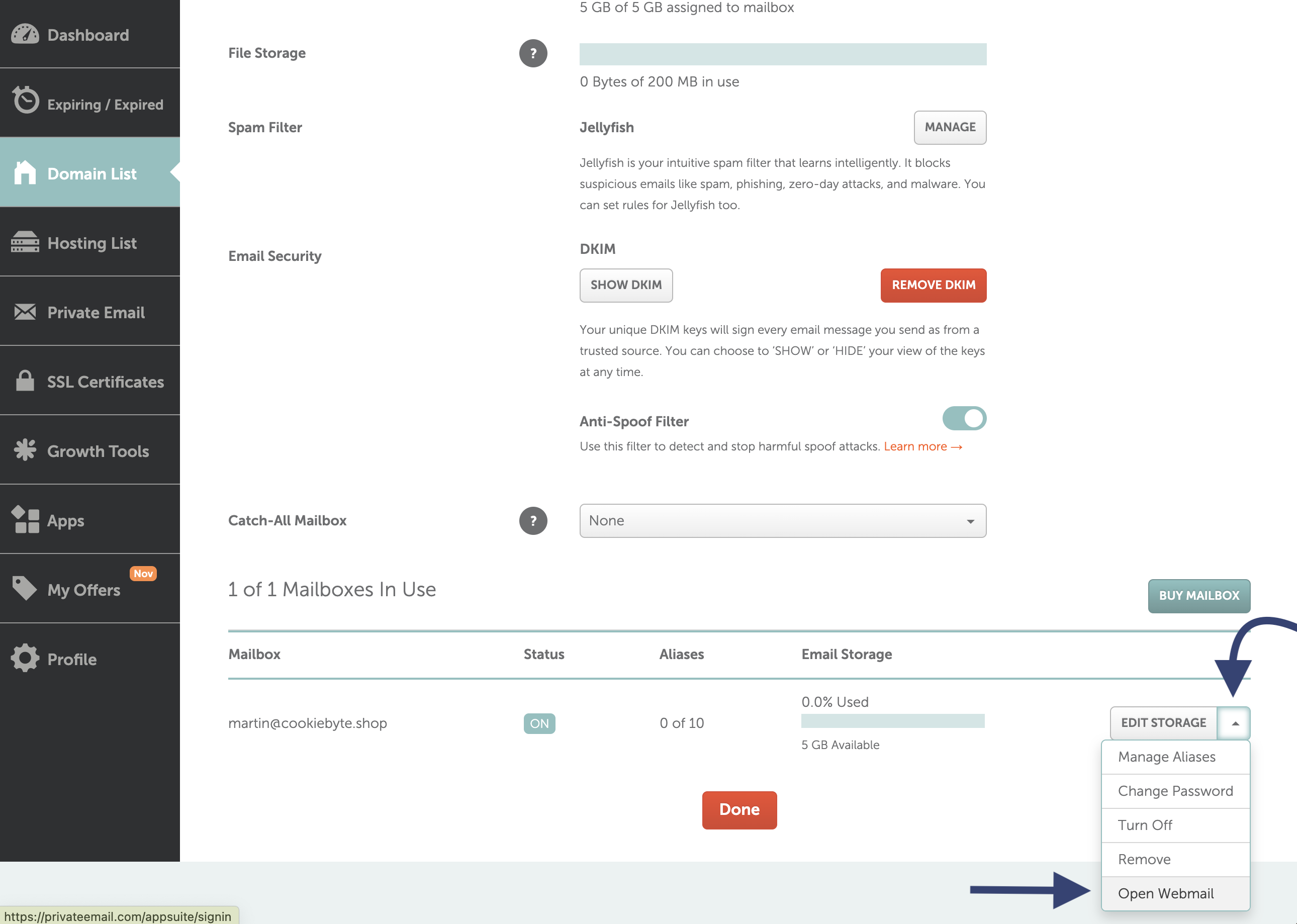 Overall, the setup process wasn’t difficult, but accessing the email inbox after creating it was a bit of a treasure hunt. We found the link in a dropdown menu, next to a button labeled “Edit Storage,” which doesn’t obviously point to your inbox. Nevertheless, the email inbox did have solid features, which were organized well, even if the design felt a bit dated when compared to Hostinger and IONOS.