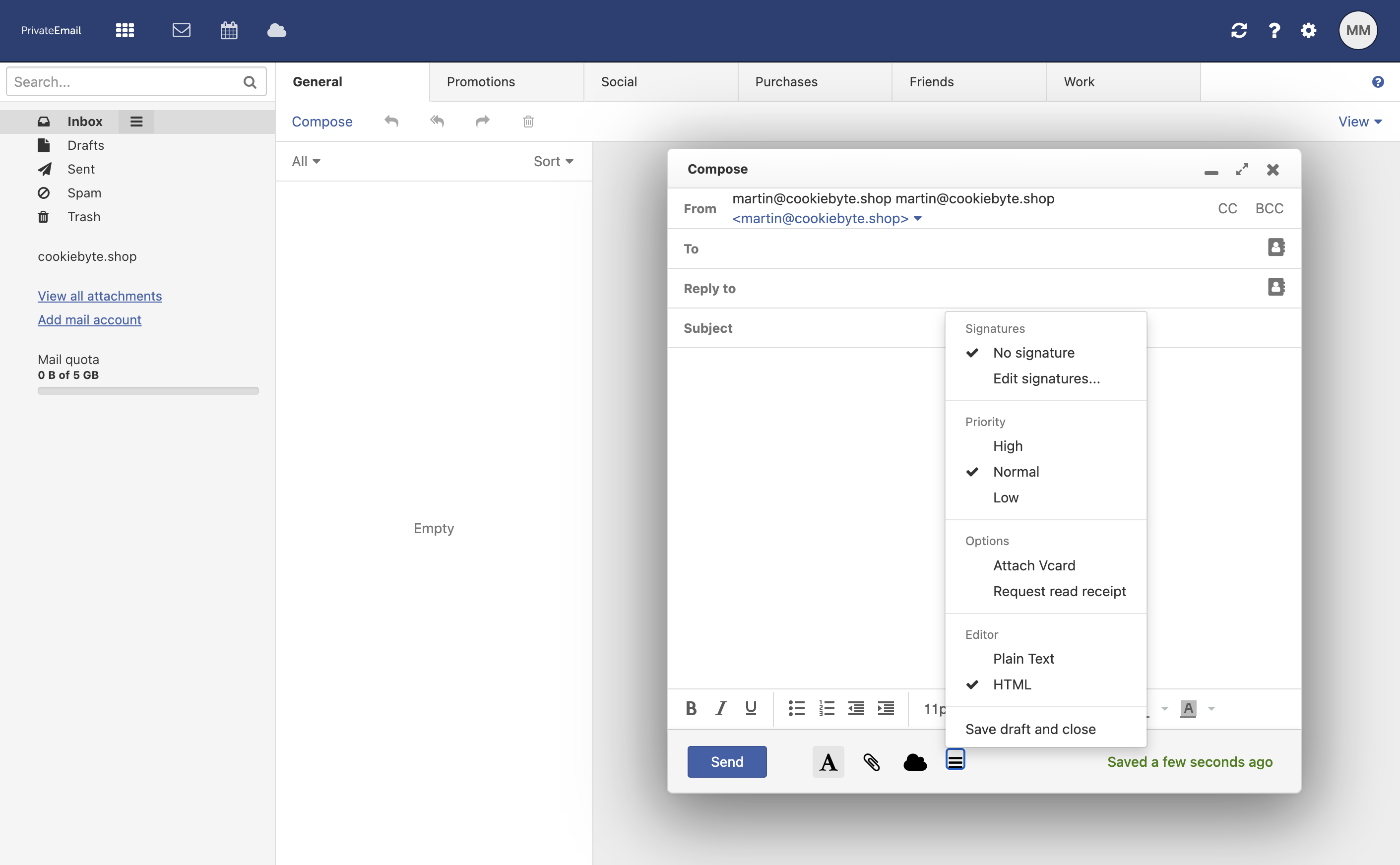 With the basics out of the way, we spent some time in the “Settings” area, testing all the features. We made an email signature, created a template, and set up some basic email filtering rules. All in all, it was a great user experience.