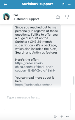 Even though CyberGhost was extra fast in connecting us to a live agent, Surfshark offered top-tier customer service with its friendly reps, who provided detailed answers to our questions. While chatting with Surfshark customer support, we even asked if they had any servers in China, and (to our surprise) we were offered a discount just for asking questions.