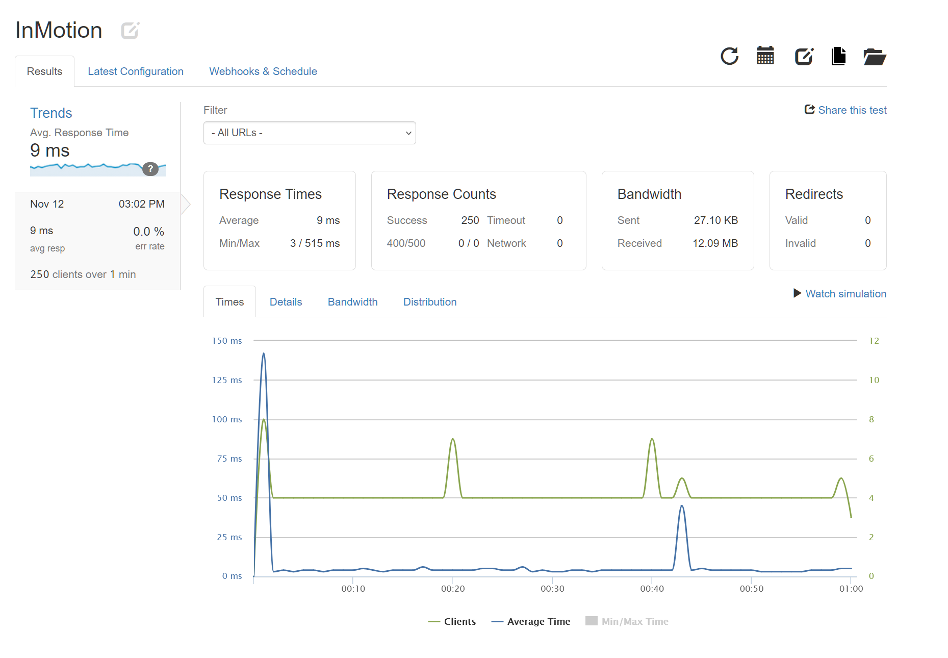 We performed a stress test with Loader.io to determine how well InMotion Hosting would handle an influx of visitors. We sent 250 virtual users to our site over the course of 1 minute.