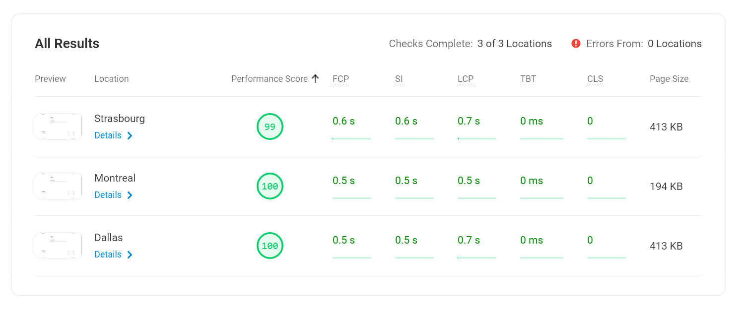 Our site performed admirably, with loading times of significantly less than a second in all three of the locations we tested.