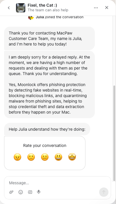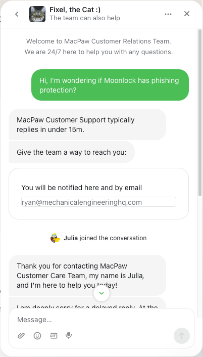 Moonlock offers support through live chat, phone, and a website form, and all options are available on any plan. The online guides are straightforward and easy to follow, covering setup, permissions, and troubleshooting. In testing, customer service responded after about an hour, so while the resources are solid, response times may vary depending on when you reach out.