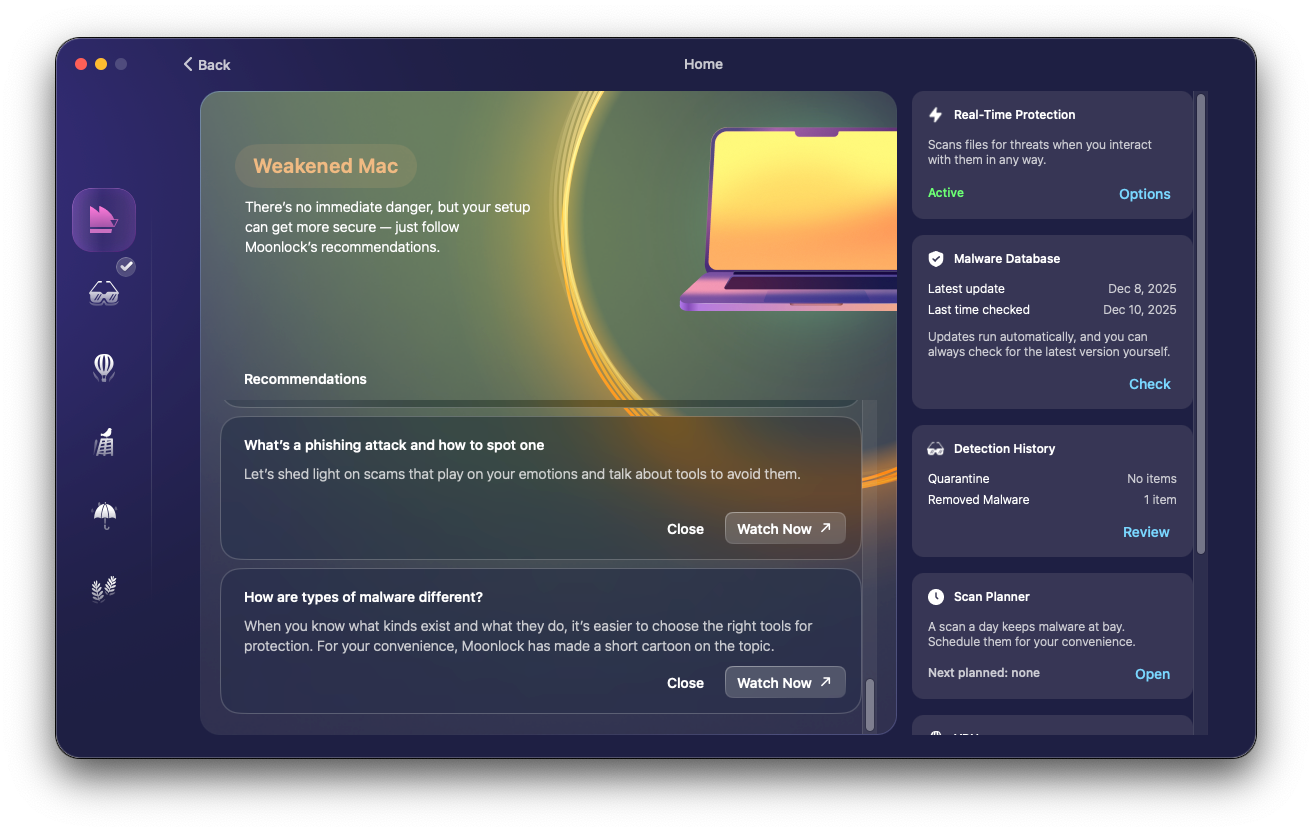 Moonlock is a great choice for Mac-only households or anyone who wants a clean, fast antivirus that doesn’t bog down the system. If you need cross-platform protection or more advanced phishing defenses, consider alternatives like Bitdefender, Norton, or Intego.