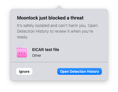 Moonlock offers manual and scheduled quick and full scans, and both were extremely fast in testing, 10 seconds and 2 minutes, with minimal system impact. It doesn’t show file counts, but results were accessible, detections were well explained, and suspicious files were quarantined immediately. All EICAR files were blocked or contained, and no false positives appeared.