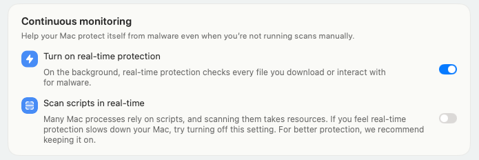 Moonlock’s real-time protection runs continuously, monitoring files, downloads, email attachments, and system activity. It blocked malware downloads instantly during testing and automatically quarantined threats. There’s no ad blocker, but it protects against malicious scripts, installers, and drive-by downloads. Real-time protection is on by default, with an option to toggle it in the interface.