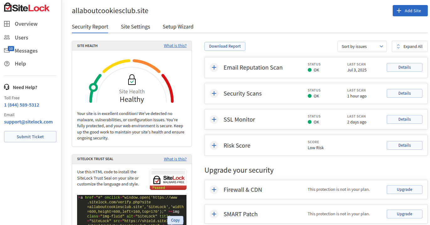 Security features are comprehensive across all tiers: free SSL certificates, malware scanning, web application firewall, DDoS protection, and automatic weekly backups. Customer support is available 24/7 via live chat, with the two higher tiers adding phone support.