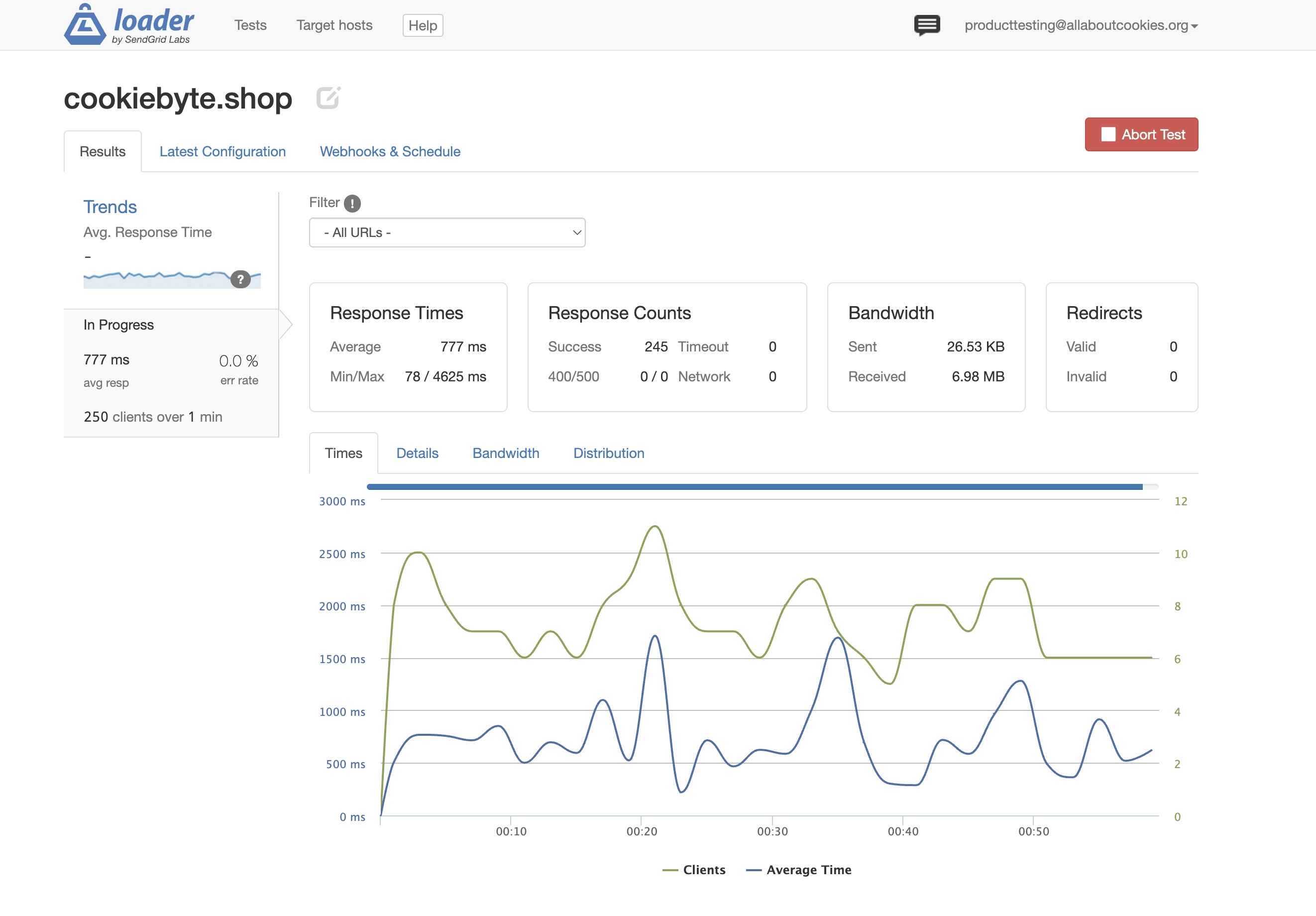Our stress test results tell a more important story. When we simulated sending 250 users per minute to each site, Namecheap maintained a flawless error rate with zero failed requests, while Bluehost experienced one HTTP failure and a 0.4% error rate. Bluehost's response time graph also showed a dramatic spike around the 45-second mark, suggesting the server struggled momentarily under load. Namecheap's graph stayed remarkably consistent throughout the entire test.