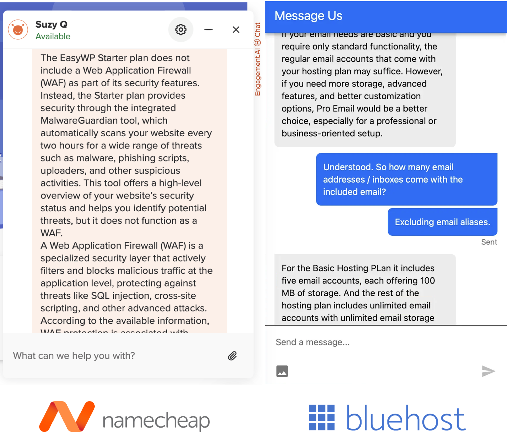 Namecheap and Bluehost both offer 24/7 chat support, and from having interacted with their support teams extensively, they are both reliable. Wait times are rarely more than a minute and usually well under that. The agents are friendly and helpful. Sometimes they provide inaccurate or outdated information, but this isn’t very common.