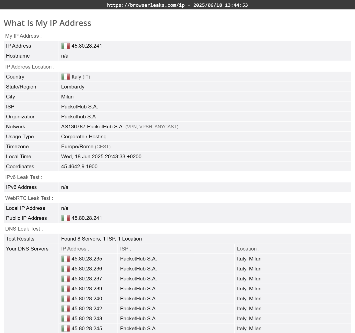 One thing to note is that there was no large list of servers, which means our online traffic was being correctly routed through the VPN server we connected to.