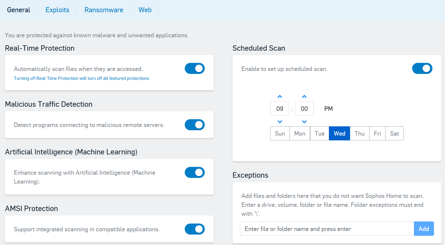 One bonus feature offred by Sophos is website exceptions. If there are websites you don’t want your antivirus to block, you can list them to be excluded. That can save you some time in the future.