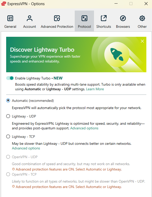 Performance drop: We love that ExpressVPN continues to evolve by expanding its Lightway protocol to Lightway Turbo. However, we experienced performance issues with the newest protocol during our recent testing. ExpressVPN has historically improved speeds, so we were disappointed that Lightway Turbo didn’t outperform the Lightway protocol.
